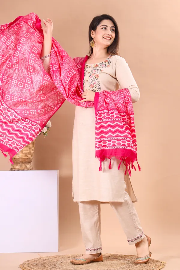 Beige Handloom Cotton Salwar Kurta Dupatta For Women